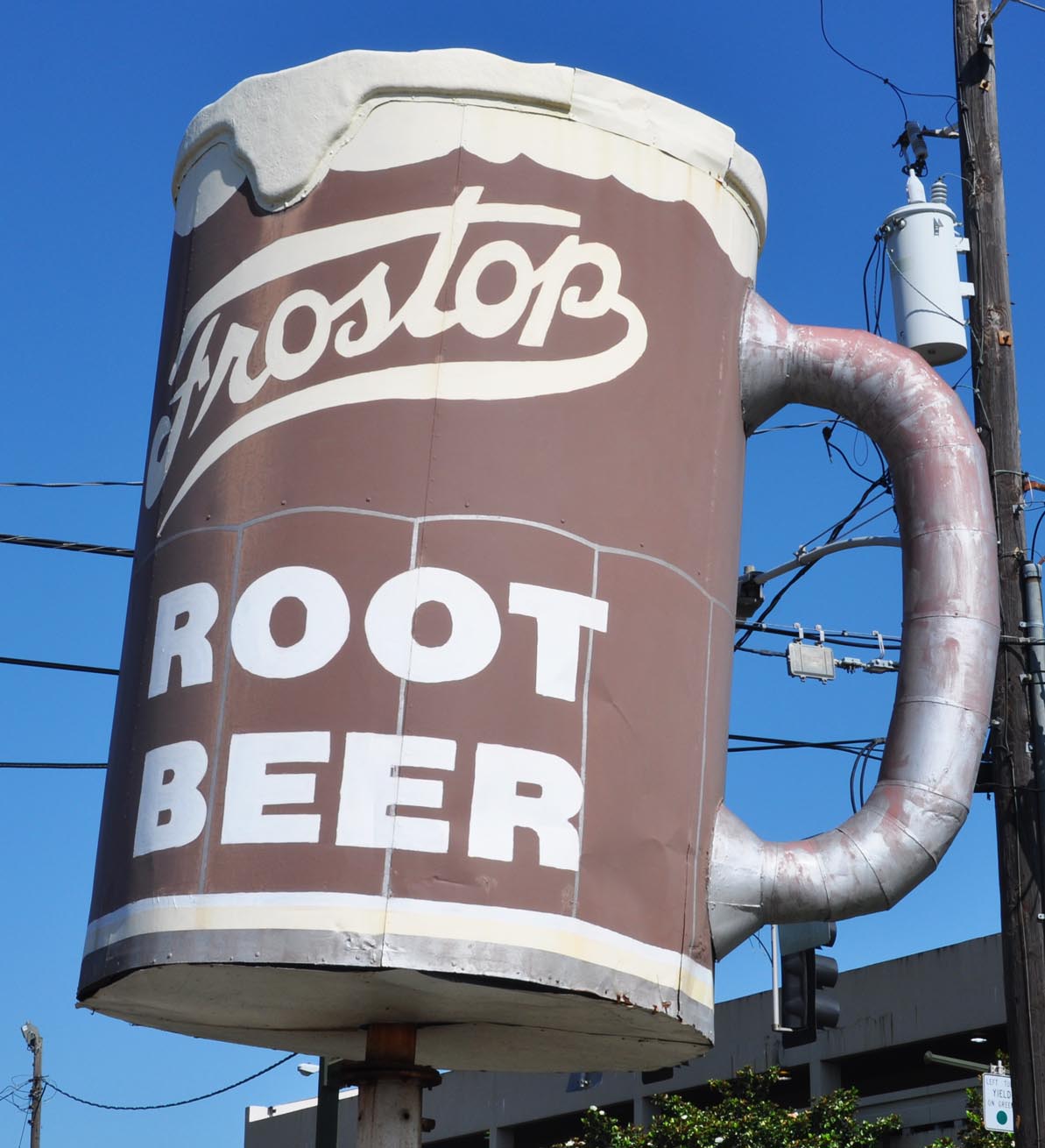 This Frostop features a classic pole sign as well as a more modern mug incorporated into their canopy. This location opened in the 1950s. In the 1990s, the mug's neon was completely restored and it rotated. In 2004, the mug was restored but by then the neon was gone and the sign was stationary. The mug was repainted again around 2009. For more, see this website. [map]