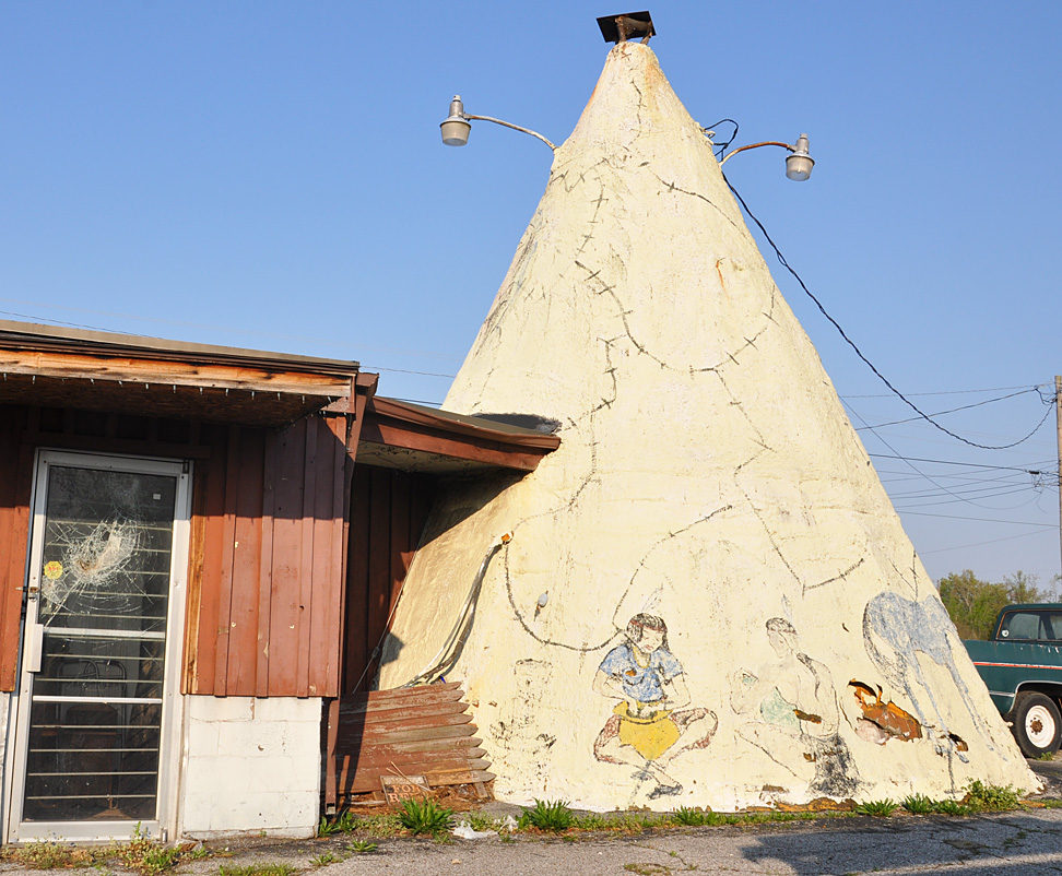 | This Teepee in Paducah was built in 1951 as the Wigwam Dairy Chief, a drive-in and ice cream stand. The building was later used as a liquor store. It has been vacant for decades. The murals were painted over sometime after 2012. For more, see this website. [map] |