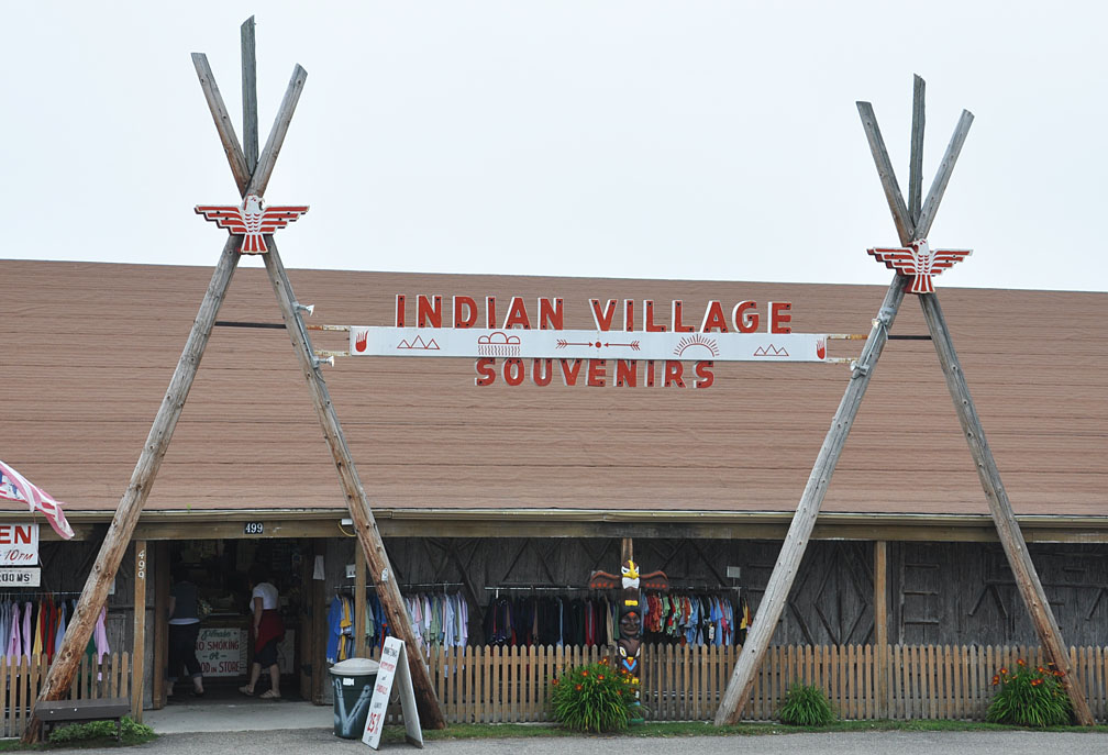 | The Indian Village was established in 1927. The gift shop originally featured demonstrations of Indian basket weaving and other crafts. The original building featured five teepees. It was rebuilt in 1977. The signs appear to be from the 1950s. For more, see this website. [map] |